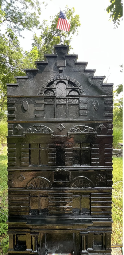 The result is a three-dimensional translation of the facade, complete with the characteristic stepped roofline, multiple tiers of windows and architectural details, and the textural quality of aged materials. The dark finish echoes the building's weathered appearance, preserving a moment in time.